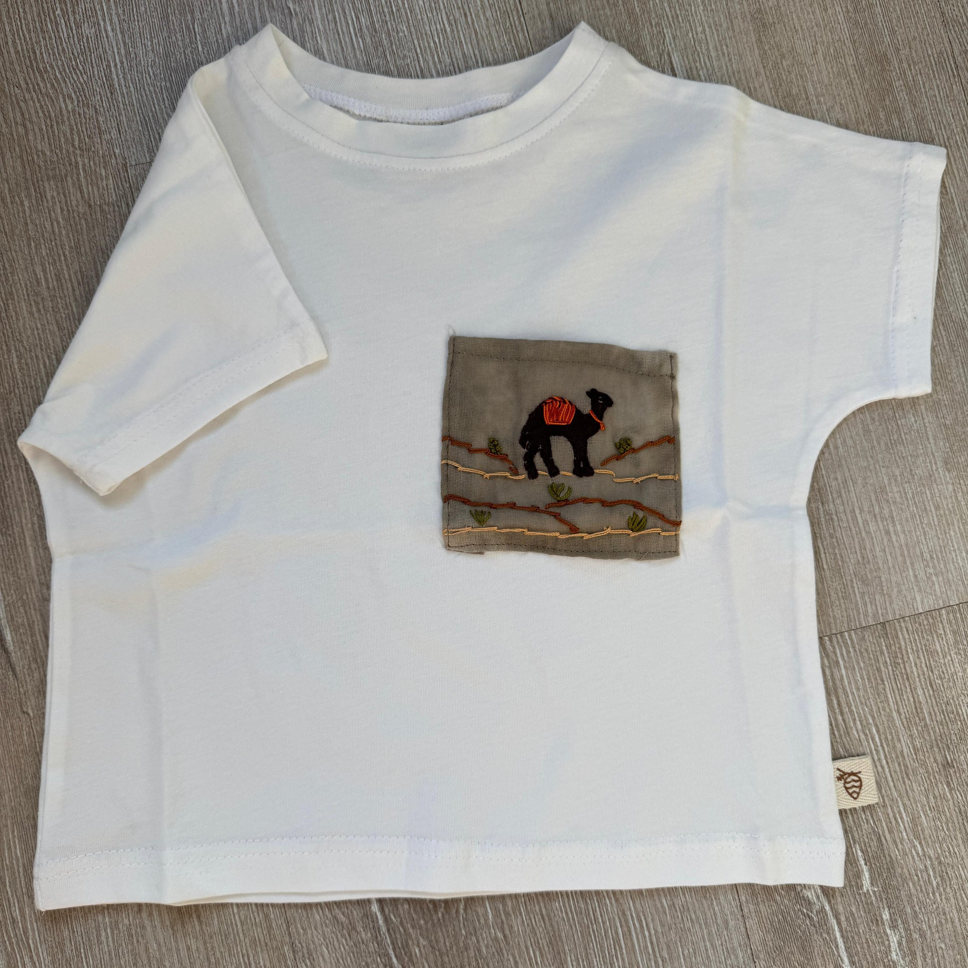 A soft and relaxed fit unisex crew neck short sleeve tee, made from cotton. Our SABR tee has been finished with a hand embroidered pocket with our symbol of SABR (patience), the camel. This T has been designed in partnership with Together for Umi to support the people of Palestine. The tee is finished with a mini pine cone label stitched by the bottom left.